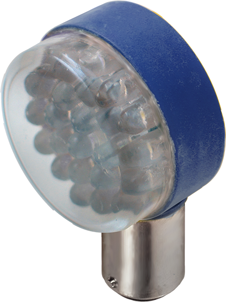 Web Description | LED Bulb, Intermediate, Rt. Angle, 1-Sided, DC Bayonet Ba15d, 2.25"Lx1.410"Dx0.91"W, Super Blue, 12/14Vdc |