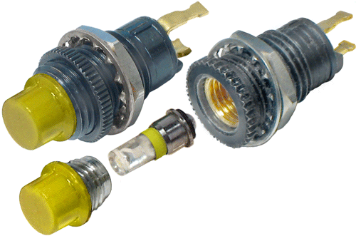 | Web Description | Panel Mount LED, Relampable Rear Mount 5/16" (8mm) Mtg.Dia., Flat Cyl Lens, 12/14Vdc, Super Yellow |